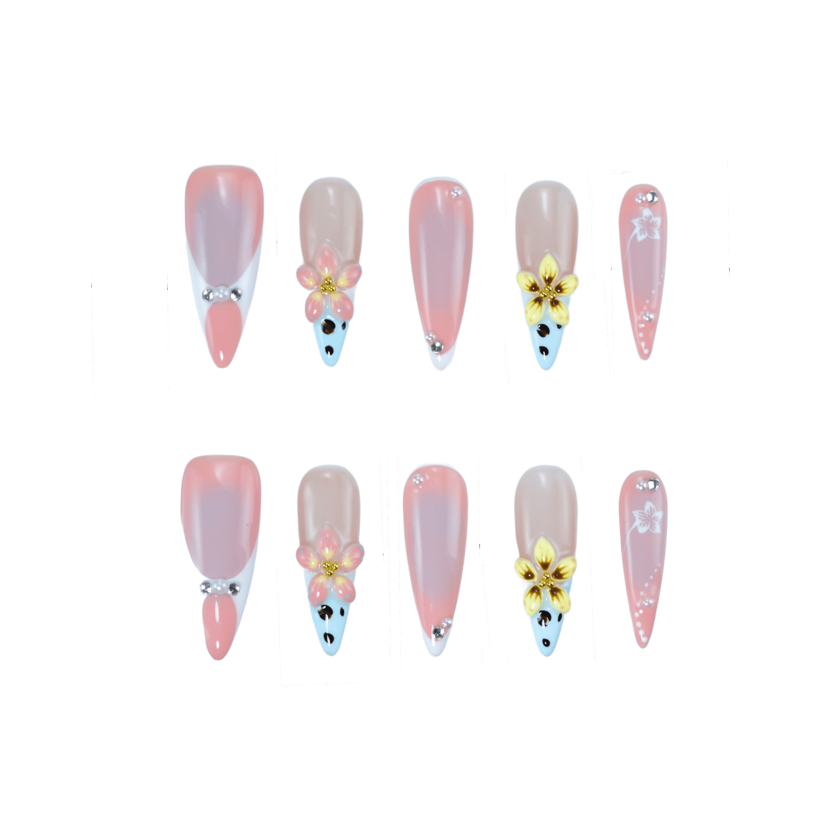 The Botanical Whimsy Floral Set is a delicate masterpiece that effortlessly blends elegance and charm. Featuring blush-pink gradients and dainty 3D floral accents, this set is designed to capture hearts and elevate any occasion. The addition of subtle rhinestone details imbues a touch of sparkle, ensuring the aesthetic remains understated yet captivating. This set is perfect for those who seek the perfect balance between whimsy and refined sophistication.