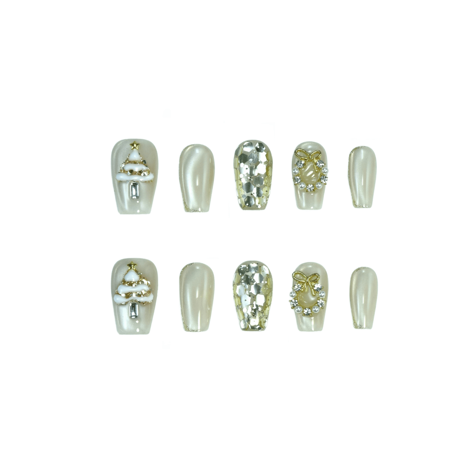 Crafted with premium-quality nail materials, these nails feature charming Christmas tree motifs that exude holiday cheer. Adorned with sparkling sequins, the design creates a festive and dazzling look, ideal for Christmas parties or winter-season gatherings. Whether you’re hosting or attending, these nails are your accessory for embracing the joyous holiday spirit.