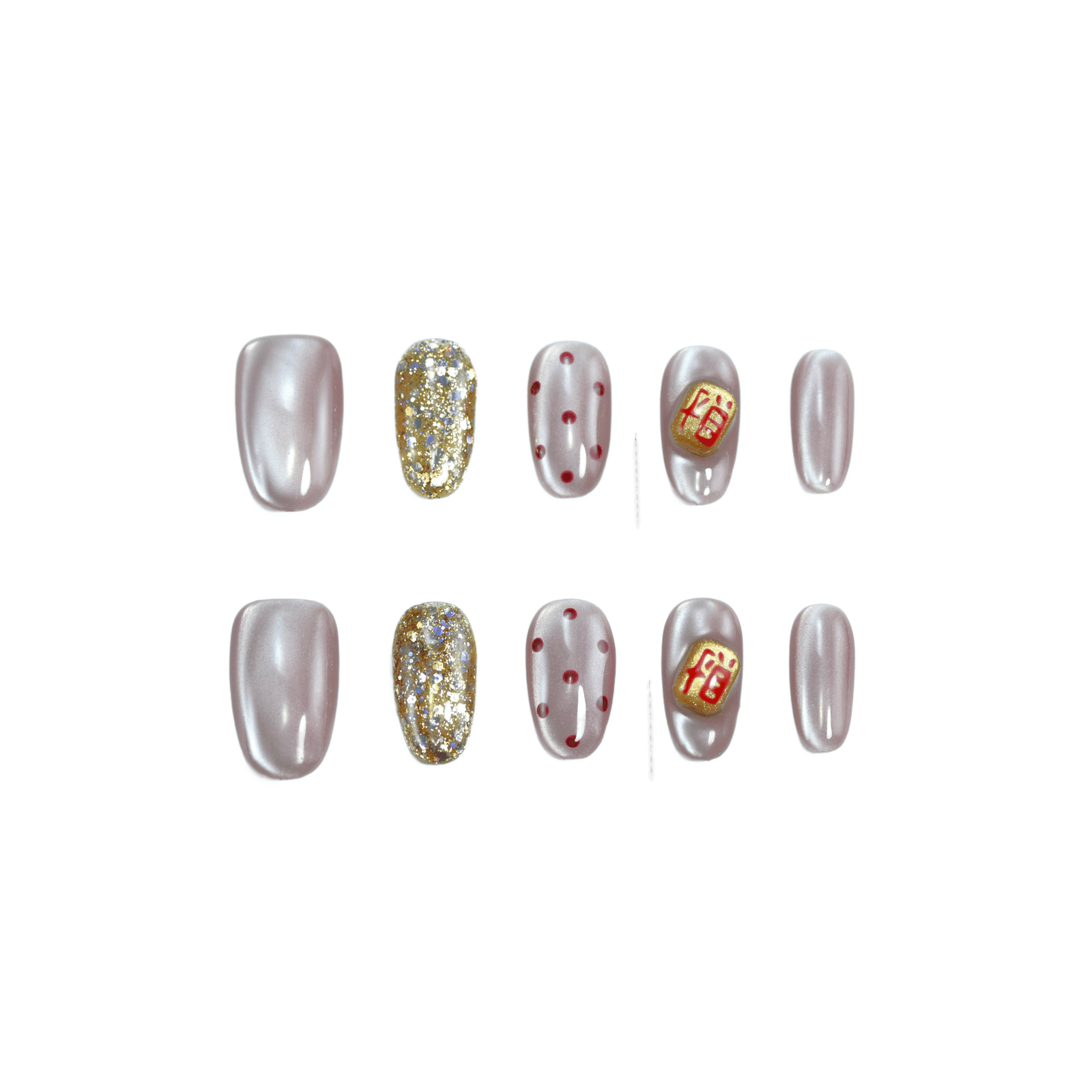 The pièce de résistance of this design is the Chinese character “发 (prosperity),” beautifully emblazoned on the ring finger. This meaningful symbol resonates deeply with Chinese culture, representing good luck, wealth, and positive energy. It’s more than just nail art; it’s a statement piece that carries cultural significance and the promise of great fortune. Wear it proudly to embrace universal positivity and enrich every moment with a touch of tradition.